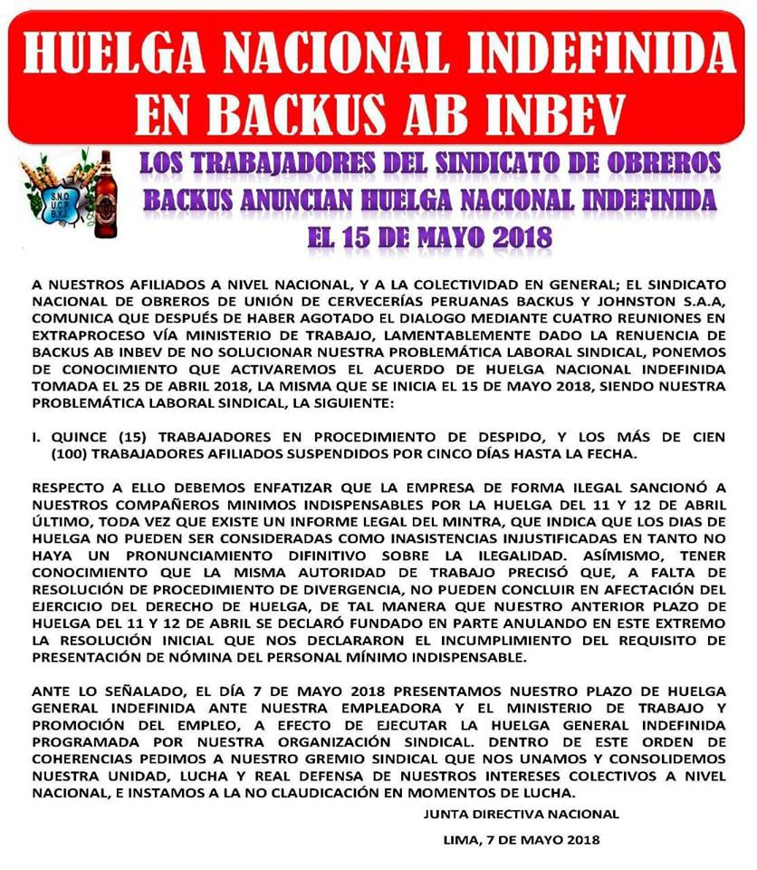 Trabajadores afiliados a Sindicato Backus a nivel nacional anuncian HUELGA GENERAL INDEFINIDA que deberá iniciarse el 15 de mayo contra la violación del #DerechoHumano al trabajo de Backus ABInBev-Ambev Peru de 15 obreros despedidos de Motupe Sindic Backus