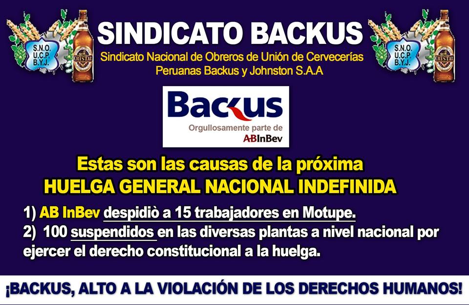 Estas son las razones del por qué los trabajadores de Sindicato Backus a nivel nacional nos vamos a la HUELGA GENERAL INDEFINIDA. Estamos hartos que Backus Anheuser-Busch InBev viole los #DerechosHumanos de nuestros afiliados. Debe reconocerse que el TRABAJO es un DERECHO HUMANO.